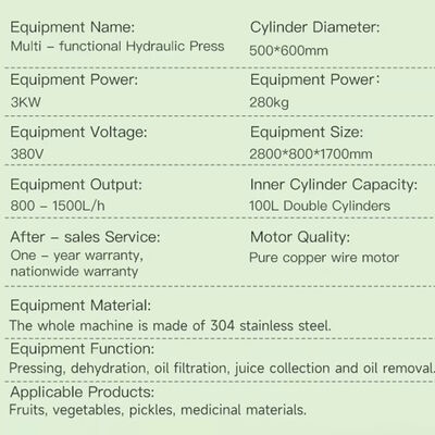 این تجهیزات پرس صنعتی در فرآیندهای کم آبی، استخراج آب میوه و نمک زدایی برای کاربردهای مختلف فرآوری مواد غذایی از جمله محصولات لوبیا، سبزیجات ترشی، مواد دارویی و سبزیجات تخصص دارد. این سیستم همچنین جداسازی جامد و مایع را برای سایر مواد مقاوم در برابر اکستروژن انجام می دهد که عملکرد آن بر اساس ویژگی های مواد متفاوت است.